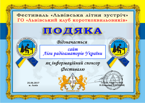 «ПОДЯКАМИ» Ради ЛКК були відзначені: - як інформаційні спонсори: сайт радіоклуба «Дельта» та сайт Ліги радіоаматорів України; - як спонсори фестиваля: Jerzy Ostrowski (SP5VFJO), Мalgorzata Ostrowska (SQ5MO) та Krzysztof Wieczerzynski (SQ5HAU); - за відеозйомки Фестиваля - Володимир Дим (UR5WDQ).