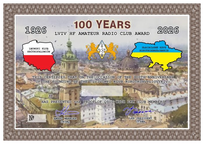 В 1926 році група викладачів та студентів Львівського політехнічного інституту заснувала "ЛЬВІВСЬКИЙ КЛУБ КОРОТКОХВИЛЬОВИКІВ". З нагоди цієї дати ГО ЛКК видаватиме диплом, з умовами якого можна ознайомитись на сайті нашого клубу lkk.org.ua