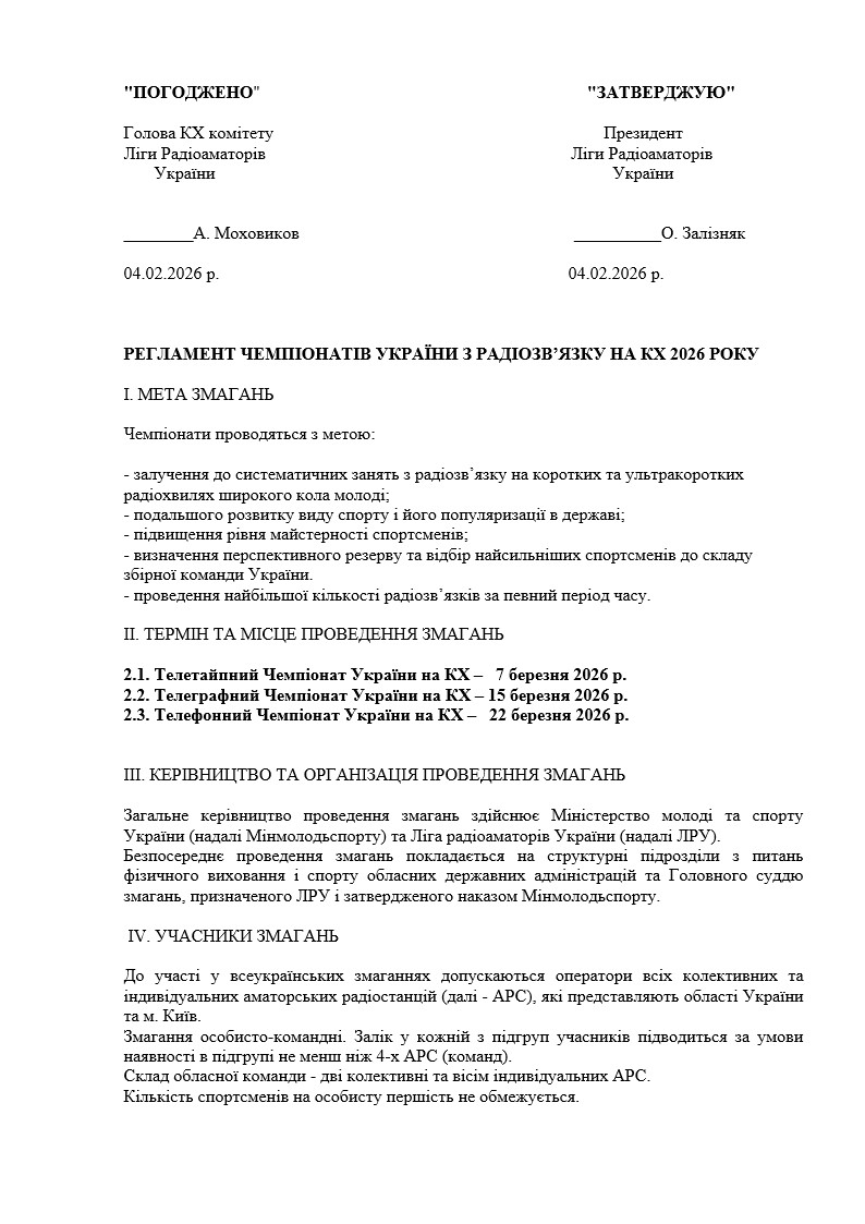 Міністерство молоді та спорту України закликає нас у жодному разі не скасовувати заходи, заплановані у календарному плані змагань з радіоспорту на 2026 рік. Проведення цих змагань — це наш спосіб продемонструвати всьому світові незламність українського духу та вшанувати пам’ять усіх загиблих спортсменів, серед яких, на жаль, є і наші колеги-радіоаматори.