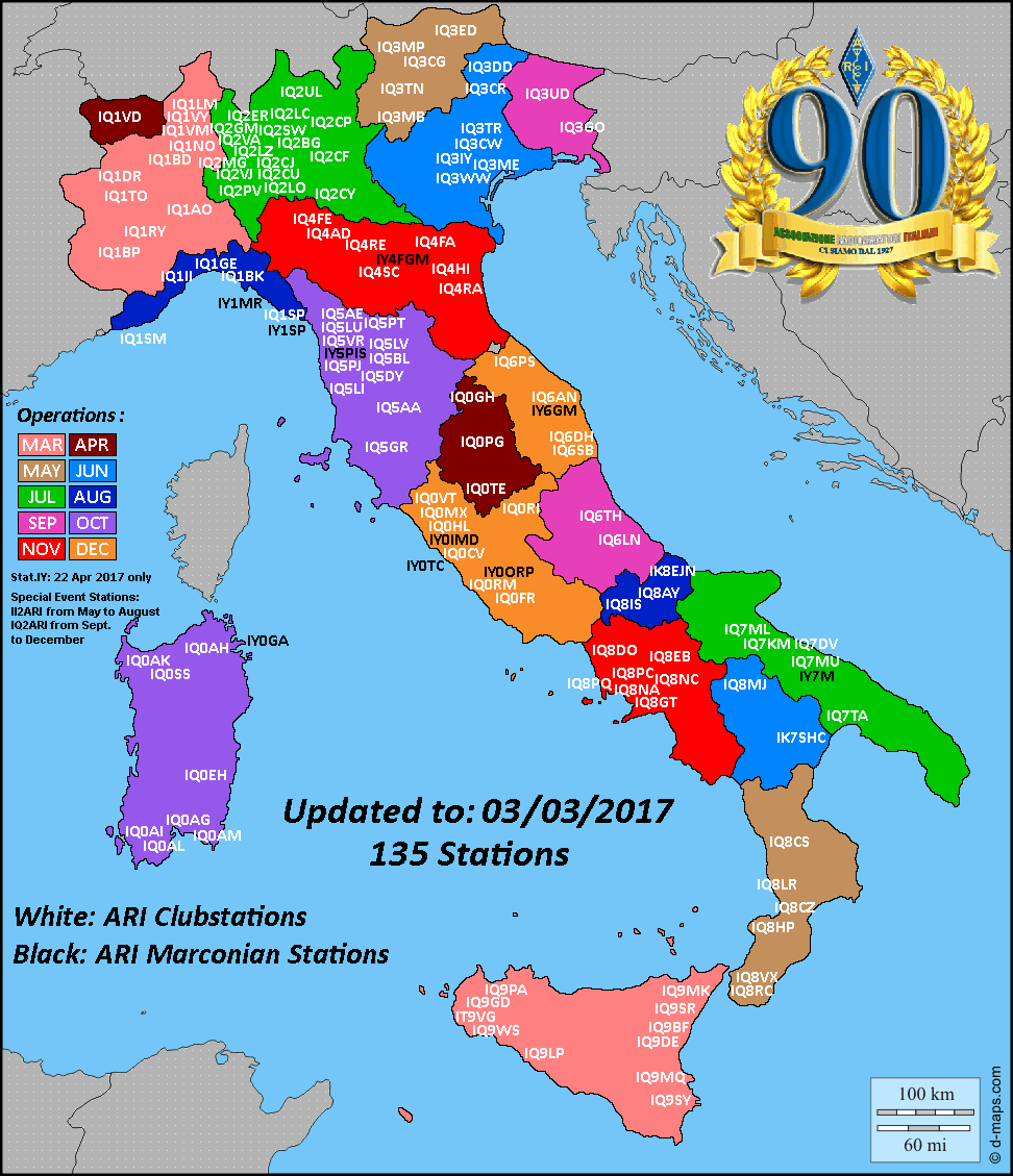 Відзначаючи 90 річчя ARI, головної асоціації радіоаматорів Італії, багато клубних стацій будуть працювати в ефірі з 01.03.2017 по 31.12.2017 на всіх діапазонах та усіма видами випромінювання. Ці станції будуть використовувати спеціальний префікс IQ. Вони будуть давати так званий код SASC (Special ASC). Кожний SASC код має таку структуру: