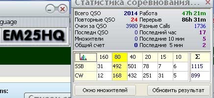 Весь час працював на швидкості 110 – 120 знаків. Все ж, людей треба жаліти – поряд "5" і "Н". І по багатьом це відчувалося. Наприклад, одночасно зі мною, працювали іспанські станції серії AN400X. Вони "гнали" швидкість 140 -160, ще й з "UP". Але коли я, наприкінці, працюючи на пошук (підбір), пропонував їм свій EM25HQ, то жоден з операторів його правильно з першого разу не прийняв. Для декотрих з них, я знижував швидкість до 70 знаків, однак у відповідь чув W255Q, EM2HHQ, EM2HSQ і т.п. Хоч свою передачу я здійснював з клавіатури і помилок не могло бути. Ну це так, штрих, про специфіку кличного знака.